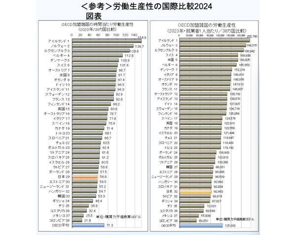 ⇒ OECD加盟38カ国で比較すると、日本の時間当たり労働生産性は29位、1人当たり労働生産性は32位と、低い状態が続いています。