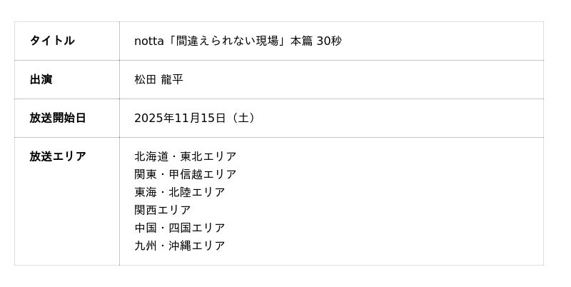 Notta株式会社(本社:東京都千代田区、代表取締役:Ryan Zhang、以下Notta)は、俳優の松田龍平さんを起用した初めてのTVCMを、2025年11月15日(土)より全国にて放送開始いたします。
