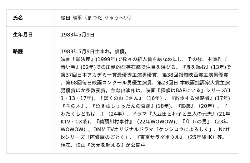 映画やドラマで多彩な役柄を演じられ、その独特な存在感と確かな演技力で幅広い層から支持を得ている松田龍平さん。