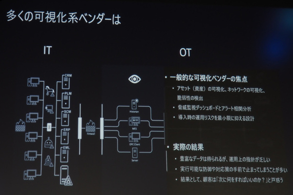 「現在のOTセキュリティベンダーは、『見えないものは守れない』と主張して、顧客企業にOT環境を可視化するツールを提供している。たしかにそれは最初のステップとしては正しいが、顧客はこう言うだろう。『ありがとう、現状は把握できました。……それで、次は何をすればいいのですか?』」(フアン氏)