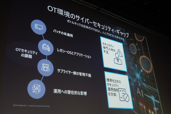 その一方で、OTセキュリティには「生産設備の運用に影響を与えてはいけない(可用性を最重視する)」という、ITセキュリティとは異なる要件がある。さらに、OTセキュリティの専門人材は不足しており、標準化されたセキュリティ運用指針も欠如している。「これらが障壁となって、OTセキュリティの発展が遅れている」(リュウ氏)。