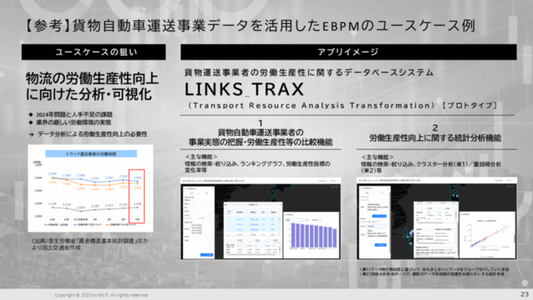データの整備・オープン化に加えて、EBPMのためのユースケース開発もProject LINKSの重要な活動です。ユースケースの例として紹介されたのは、貨物自動車運送事業データを活用したトラック運送業の労働生産性に関するデータベースシステム「LINKS_TRAX」です。貨物自動車運送事業データは、トラックの運送業者が運輸局へ提出する事業実績報告書をもとに作成されています。このデータと毎月勤労統計調査をもとに、「LINKS_TRAX」はトラック運送事業者の労働生産性指標の比較や統計分析といった機能を提供しており、業界の労働環境・生産性の実態把握と改善に寄与します。