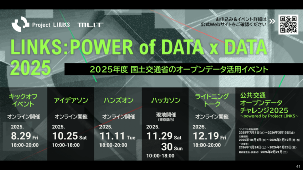 国土交通省では、国土交通分野の行政情報を官民さまざまなユースケースで活用しやすいデータに整備し、オープンデータ化するプロジェクト「Project LINKS(リンクス)」に2024年7月から取り組んでいます。2025年度は、「LINKS:POWER of DATA x DATA 2025 国土交通分野のオープンデータ活用チャレンジハッカソン」と題し、キックオフイベント、アイデアソン、ハンズオン、ハッカソン、「公共交通オープンデータチャレンジ 2025 ~powered by Project LINKS~」と、6つのイベントを実施いたします。