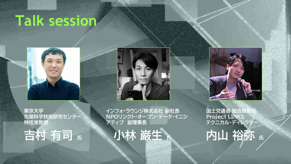 パネルトークでは、建築家で都市計画やまちづくり、都市デザインへのデータやAI活用が専門の東京大学 先端科学技術研究センター 特任准教授の吉村 有司 氏、官公庁のオープンデータ活用やユースケース開発を支援しているCode for YOKOHAMA 代表、情報アーキテクトの小林 巌生 氏、国土交通省で「Project LINKS」をリードする内山氏が、都市政策へのオープンデータ活用に関する2つのテーマで意見を交わしました。