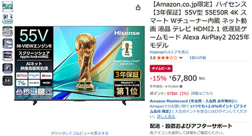 大画面4Kテレビを高コスパで導入! Hisense(ハイセンス)のAmazon.co.jp限定モデル「55V型 4KスマートTV 55E50R」が、Amazonタイムセールに登場しました。