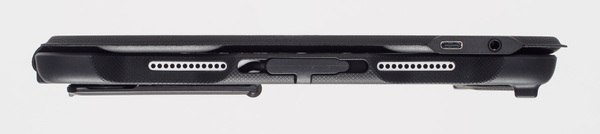 iPadとの接続はケース部に内蔵されているUSB-Cケーブルを直接差し込むだけのシンプルな設計だ。第10世代iPadではヘッドホンジャックが廃止されたが、教育現場で生徒たちがスピーカーから授業を聞くわけにいかないため、3.5mmのポートを搭載している。