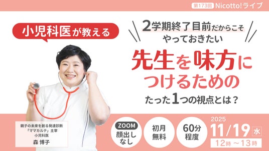 (株)パステルコミュニケーション(本社:東京都豊島区、代表取締役:吉野加容子)が運営する、発達障害・グレーゾーンの子どもを育てるママがいつでも学べて相談できるオンライン子育て塾「Nicotto!塾」は、2025年11月19日(水)お昼12時より、「先生を味方につけるためのたった一つの視点とは?」をテーマにオンラインライブを開催いたします。https://desc-lab.com/nicotto202201/?prt1119