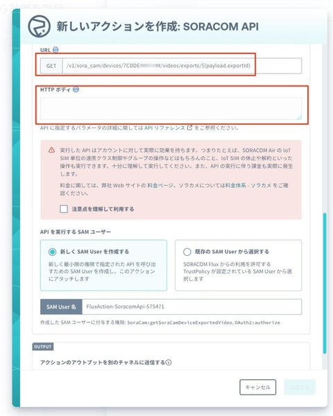 <device_id>には、対象となるソラカメのデバイス ID に置き換えてください。${payload.exportId}は、ステップ2 のAPIレスポンスに含まれるエクスポートIDを参照しています。Flux が SORACOM API を呼び出すときに置き換えるのでそのまま${payload.exportId}を記載してください。 SORACOM Flux では、前のアクションの出力がpayloadという変数に格納され、その中の値を${payload.キー名}で参照できます。