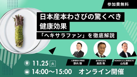 「プロダクティブ・エイジングがあたりまえの社会を創る」というビジョンのもと、ヘルスケアブランド「NOMON」を展開するNOMON & Co. 株式会社(本社:東京都千代田区、代表取締役:安藤進ノ介)は、わさび研究の第一人者である金印株式会社の奥西勲氏、ヘキサラファン研究のトップランナーである野内類先生をゲストにお招きし、日本産本わさび由来の健康成分「ヘキサラファン」をテーマとしたオンラインセミナーを2025年11月25日(火)に開催いたします。
