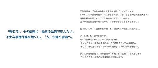 急回復するインバウンド需要の裏側で、民泊清掃の現場は疲弊。清掃漏れの不安から解放し、“人”が輝く現場を実現する「タノムデ清掃管理」がサービスサイトを公開。