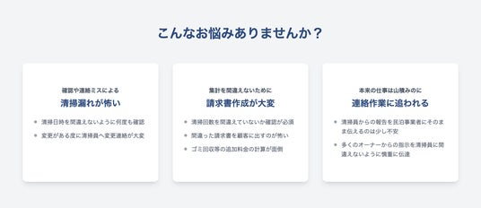 本サービスは、清掃依頼の自動取得からスタッフのアサイン、清掃報告、請求書作成までを一元化・自動化することで、対応工数を最大90%削減します。