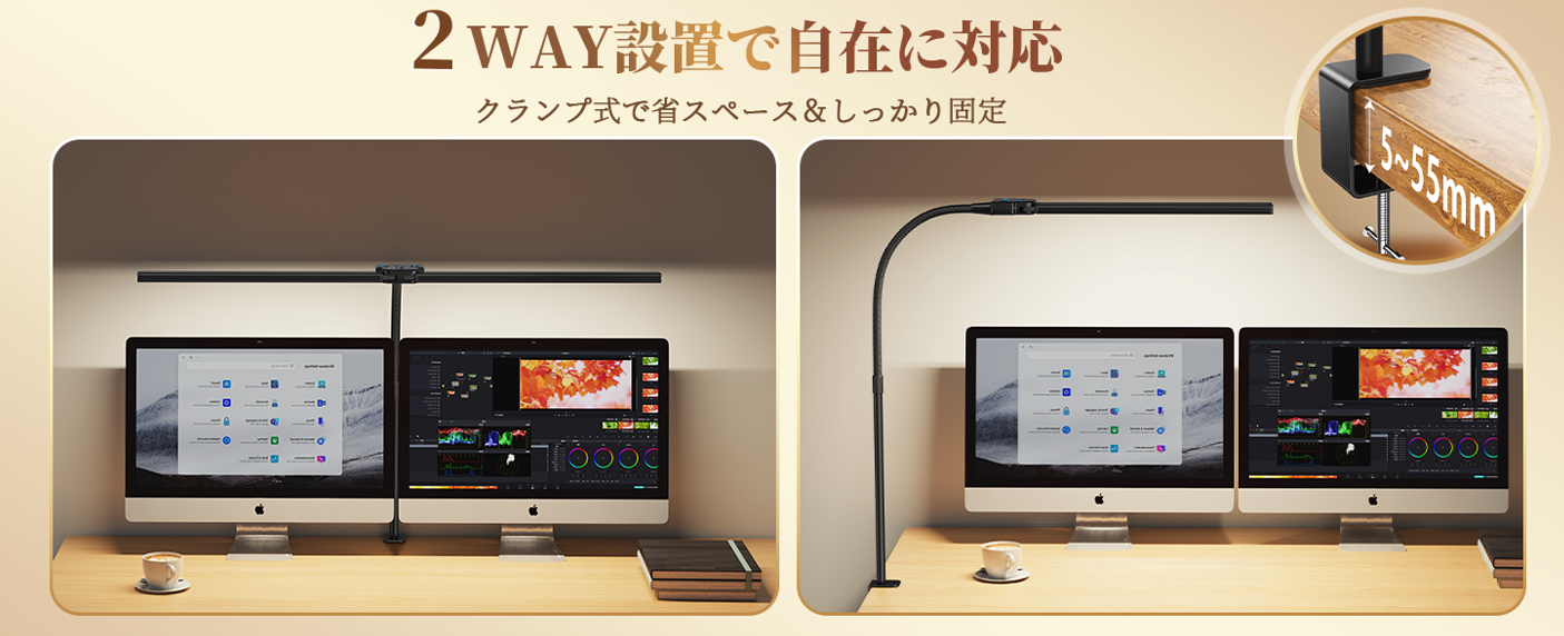 工具不要で簡単に組み立て可能。厚さ5.5cmまでのデスクにクランプ固定し安定。日本語取扱説明書と組立動画付きで初めてでも安心。1年間保証付きで、24時間以内の迅速サポートも提供します。