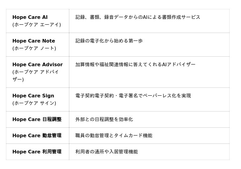 従来より提供しているAI×クラウドのトータル的なDXサービスの「Hope Care DX」(ホープケア ディーエックス)に加えて、業務効率化システムを機能別にサブスクリプション方式での提供を開始。
