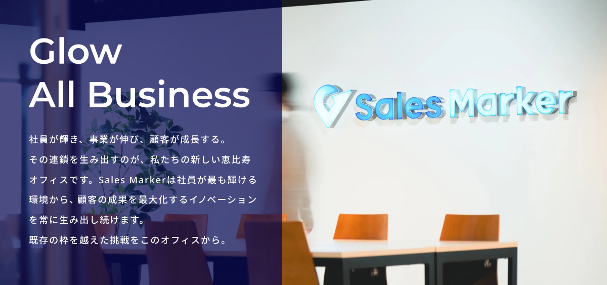 顧客起点で営業やマーケティング活動を戦略的に自動化する国内初※1の成長モデル「インテントセールス」を実現する『Sales Marker(セールスマーカー)』。その開発元である株式会社Sales Marker(本社:東京都渋谷区、代表取締役 CEO:小笠原 羽恭、以下:当社)は、さらなる事業拡大と組織の成長を見据え、本社を恵比寿ガーデンプレイスタワーへ移転しました。新オフィスは「Growth(成長)」をテーマに、社員一人ひとりが伸び伸びとはたらける“心躍る空間”となるよう設計されています。
