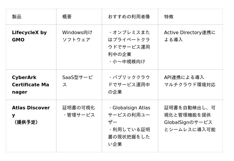 1. LifecycleX byGMO、2.CyberArk Certificate Manager、3.Atlas Discovery(提供予定)