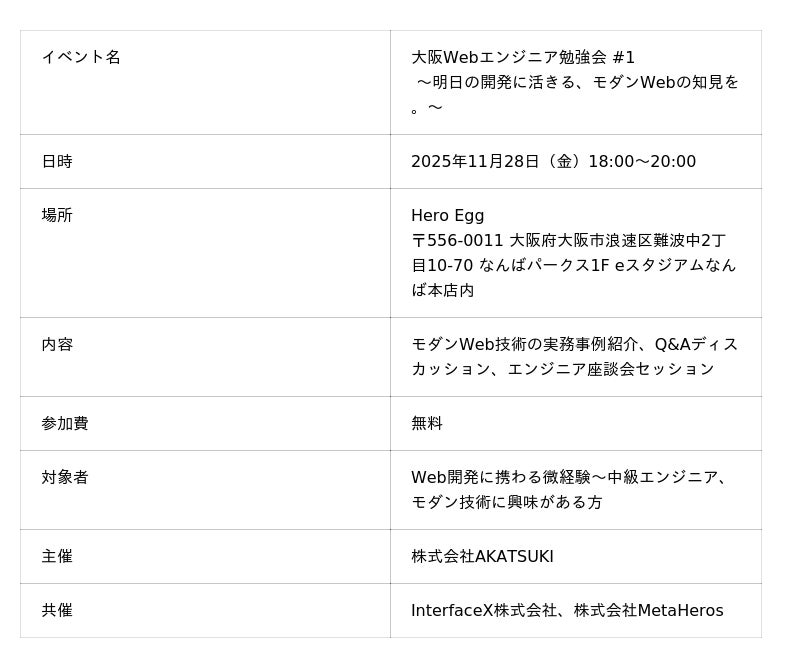 株式会社Meta Heroes(本社所在地:大阪府大阪市、代表取締役:松石和俊、以下「当社」)は、当社が運営するDX教育施設「Hero Egg」にて、「大阪Webエンジニア勉強会 #1 ~明日の開発に活きる、モダンWebの知見を。~」を、株式会社AKATSUKI、InterfaceX株式会社と共同で開催いたします。