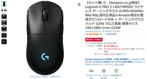 高性能マウスと専用パッドがセットになっており、単品で買うより1,600円お得。参考価格17,270円のところ、17%オフの14,300円で手に入ります。