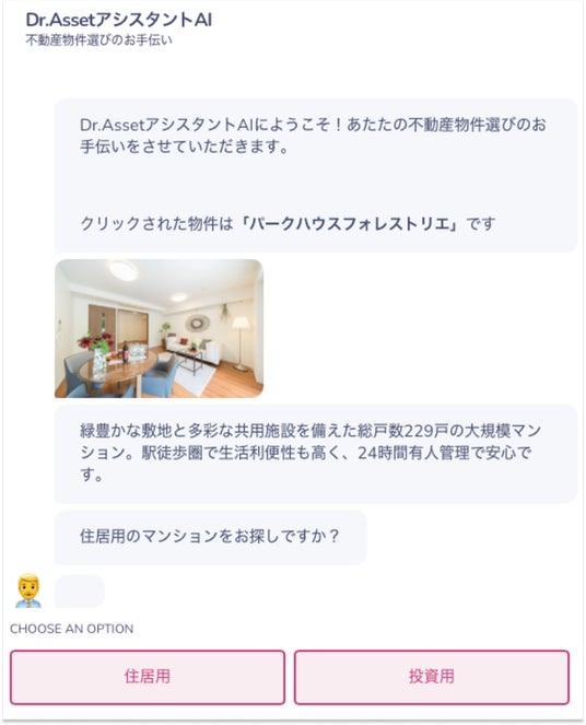 AIとの対話により、「立地・利便性重視」や「育児環境重視」などの利用者属性に基づき、周辺環境や災害リスク等のデータ利活用が可能です。