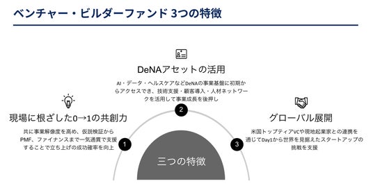 DVB3ファンドでは今後、AIによるゲームチェンジがあらゆる産業・社会構造を変革していく中で、特定産業の実務知見や社会変化の兆しを捉える洞察力を持つ起業家や、米国を起点にグローバル事業への強い意欲を持つ起業家と、ベンチャービルダーファンドチームの事業立ち上げの専門知と実装支援、DeNAの保有する事業アセットを掛け合わせ、三位一体で次世代スタートアップの創出を加速していきます。