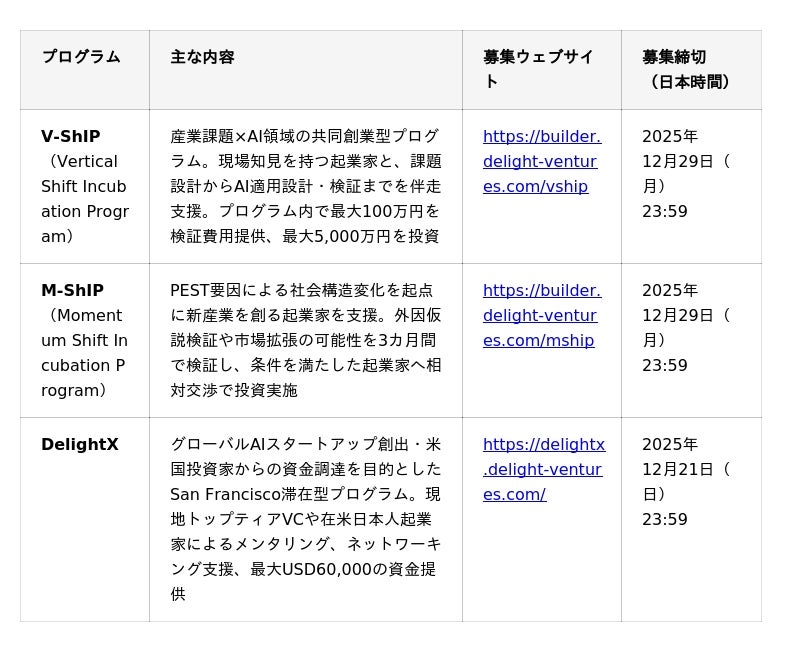 さらに、2025年には新たな取り組みとして日本から世界を目指す起業家を対象に、米国市場でのAIスタートアップ創業を支援・投資するプログラム「DelightX」を開始し、投資・支援の対象領域の拡大を進めてきました。