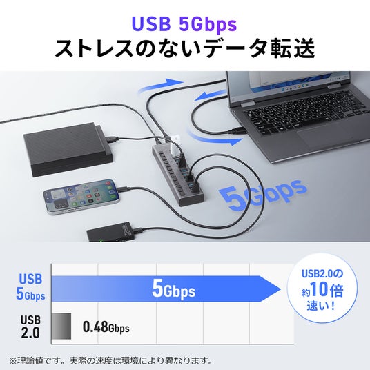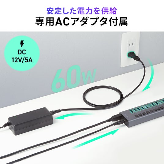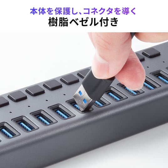 最大13ポートを備え、ACアダプタによる安定した給電と5Gbpsの高速通信を両立した、個別スイッチ付きで、必要な機器だけを効率的に使えるセルフパワーUSBハブ