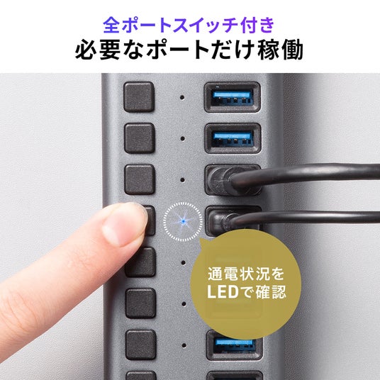 全13ポートに独立スイッチを搭載。使用しないポートをオフにして節電できるほか、LEDランプで通電状態をひと目で確認できます。複数デバイスを使い分けるユーザーにとって、視認性と操作性を兼ね備えた設計です。