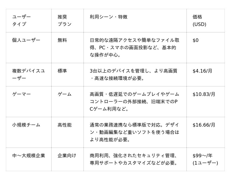 DeskInは個人向け4プラン(無料/標準/ゲーム/高性能)と企業版を展開しています。