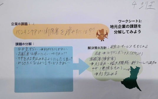 生徒の作成したワークシートの例。若者と高齢者など、世代や環境によってサービスを利用したくなる条件は大きく異なるため、それぞれに合った施策が必要だと考え提案を行った。