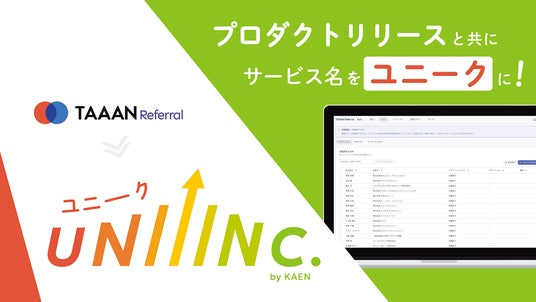 株式会社KAEN(本社:東京都渋谷区、代表取締役:川田 勇輝、以下「当社」)は、リファラル型商談獲得プラットフォーム「TAAAN Referral」の名称を「UNIIINC.(ユニーク)」へと変更し、ロゴデザインを刷新したことをお知らせいたします。また、同日より、イノベーター(企業)とエヴァンジェリスト(個人)を繋ぐ新プロダクトの提供を開始いたしました。