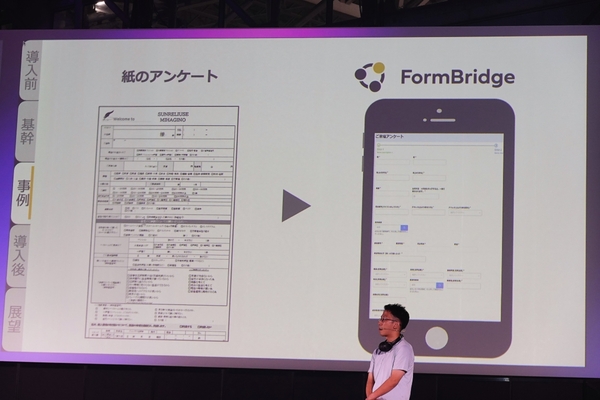 例として挙げられたのが「来場予約・アンケート」のDX事例だ。従来は、外注した予約フォームの情報を、手入力でkintoneに転記。来場時の紙のアンケートも手入力するという二重の手間が発生していた。外注コストや紙アンケートゆえの未記入項目の多さも課題だった。