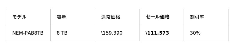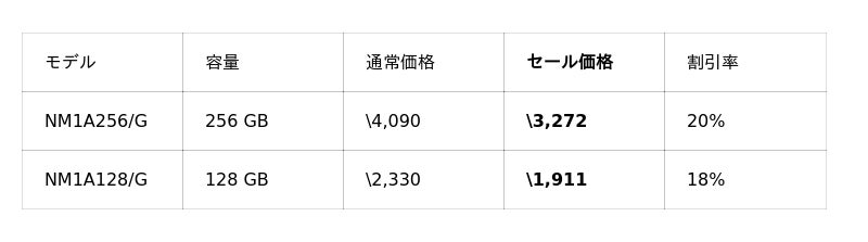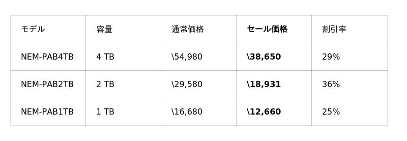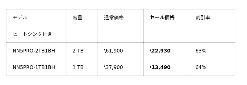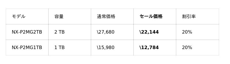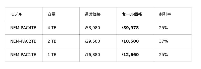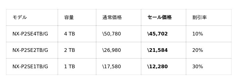 PS5動作確認済SSD NEM-PACシリーズの2TBモデルが37%OFFの¥18,500をはじめ、PS5向けSSDラインアップ全体的にお求めやすい価格となっています。また、NEM-PA系モデルがそのまま入るSSDケース NX-EN1SEもセール対象となっており、古いSSDを外付けSSDとして活用できます。PS5 SSD買い替えを検討中の方は、あわせてご検討ください。