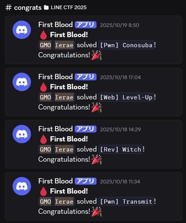 「LINE CTF 2025」において、GMOイエラエは出題された全ジャンルの問題で、最初に正解したチームの称号(以下、First Blood)を獲得しました。