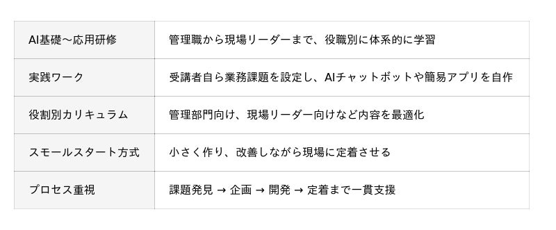 単なる研修にとどまらず、業務改善・採用力強化・新規事業・社内文化まで成果が広がっている点が大きな特徴です。