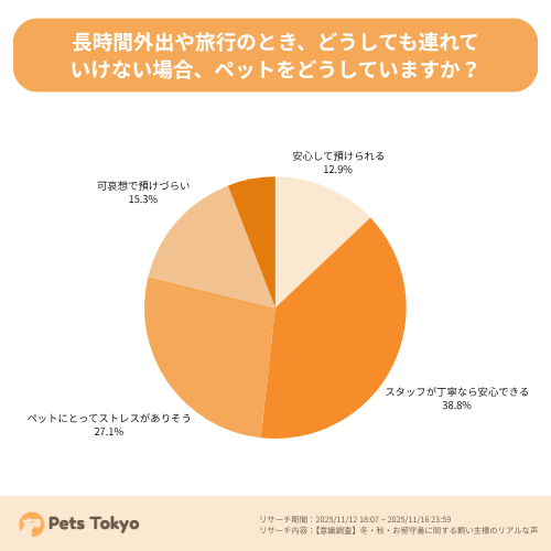 Lehman Holdings株式会社のグループ会社である、Pets Tokyo株式会社(本社:東京都千代田区、代表取締役:Raymond)は、旅行や長時間外出時におけるペットの預け先について、飼い主の意識を調査しました。