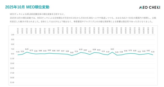 当社がMEOチェキで計測する85,000店舗の平均順位は、月初9.10位から月末9.38位へわずかに後退しました。全体としては8.2~9.6位の範囲で推移し、季節要因やアルゴリズム更新による大きな変動は見られず、比較的安定した月となりました。