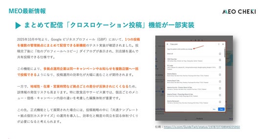 1つの投稿を多拠点へ同時配信できる「クロスロケーション投稿」は、運用効率化が期待される一方、地域差・営業時間差に起因する誤情報抑止の体制整備が重要です。
