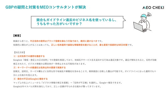 本レポートでは、MEO対策に関するよくあるご質問に対し、当社コンサルタントがわかりやすく解説しています。