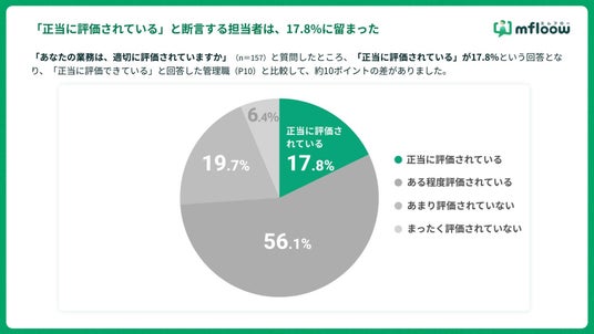 「あなたの業務は適切に評価されていますか」と質問したところ、「正当に評価されている」と回答した担当者は17.8%に留まりました。また、「あまり評価されていない」「全く評価されていない」と回答した担当者は4人に1人(26.1%)にのぼり、バックオフィスの現場における評価への不満が定量的に示されました。