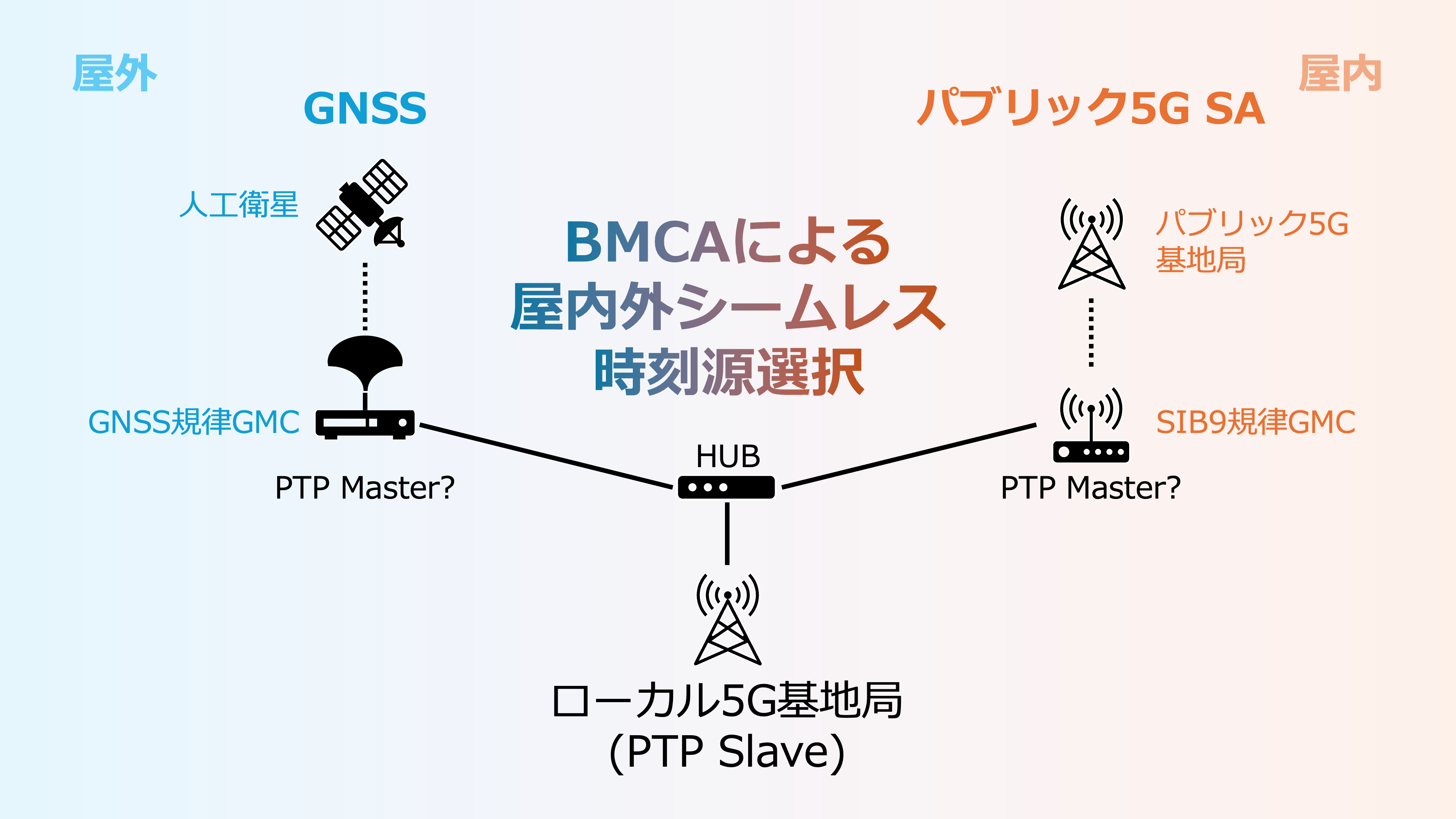 図:ローカル5G基地局の時刻源として屋内外シームレスにGNSSまたはパブリック5G SA SIB9を