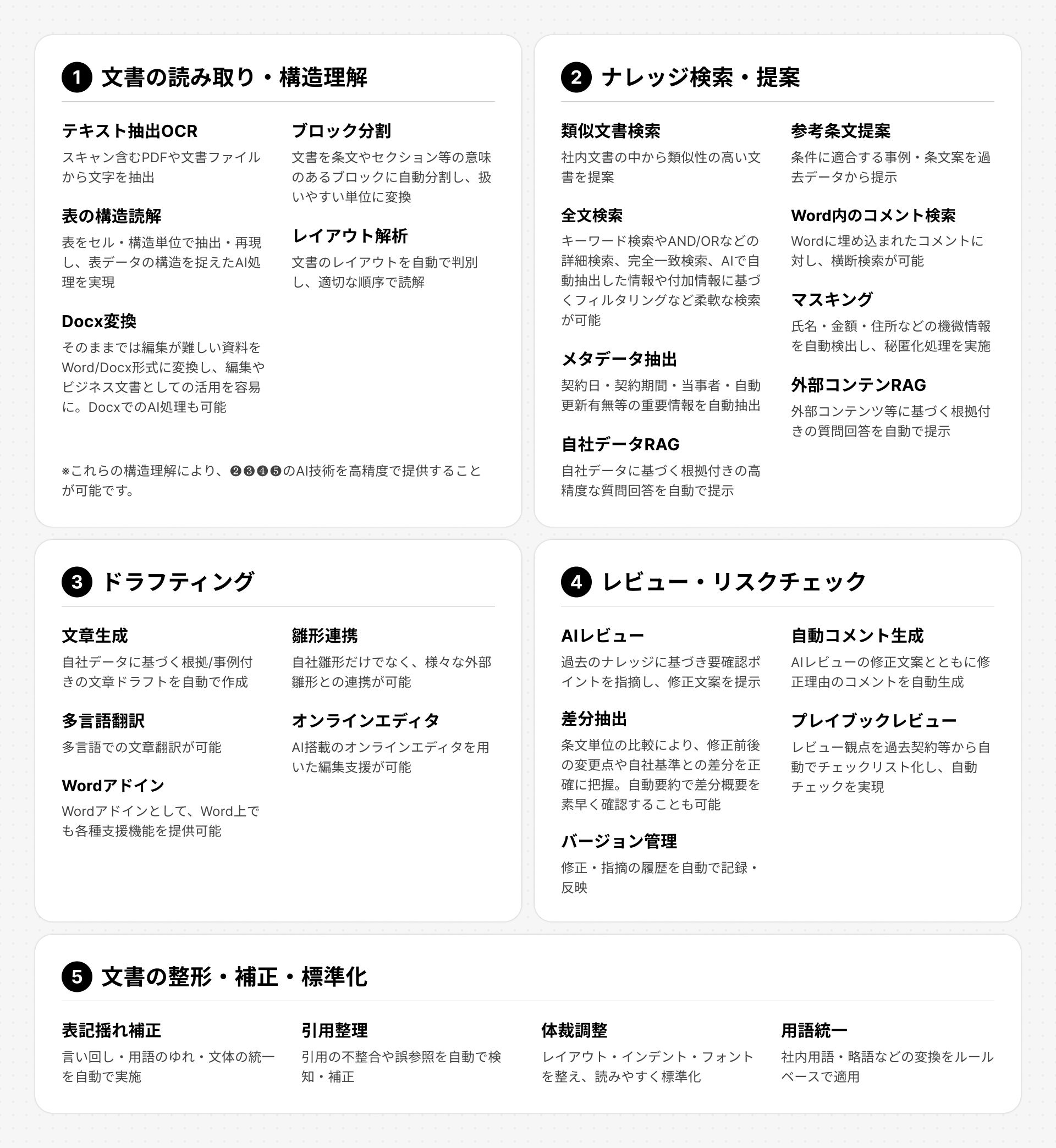 「FRAIM」はこれまで、契約書・規程・社内文書といった企業文書を対象に、積極的な技術開発やサービス運営を通じて、独自の文書処理基盤を構築してきました。主力サービスの「LAWGUE」は、2018年からサービスを展開し、様々な企業・士業・官公庁等の文書作成・レビュー・ナレッジ活用を支援して参りました。「FRAIM AI Agent」は、支援実績に基づく専門知と技術資産を“手足”として自在に組み合わせて活用できる、実務現場に最適化されたAIエージェントです。