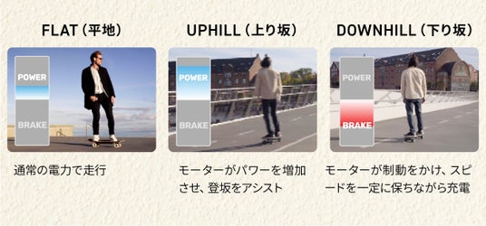 - 下り坂:自動で制動(ブレーキ)をかけ、スピードが出すぎるのを防ぎながらバッテリーを回生充電。