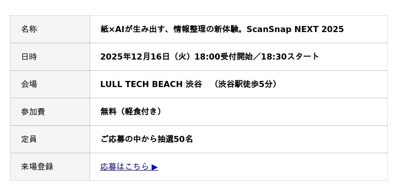 株式会社PFUは、イメージスキャナー「ScanSnap」をテーマにしたユーザーミートアップイベント「ScanSnap NEXT 2025」を開催します。本イベントでは、AIの進化がもたらす新しい情報整理のかたちを、ScanSnapとAIの連携体験を通じて“体感”できる特別な機会を提供します。ScanSnapを愛用するユーザー同士がつながり、“自分なりの情報整理スタイル”を共有しあうリアルな交流の場としてもお楽しみいただけます。