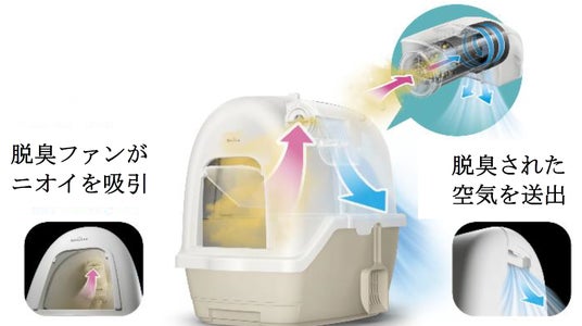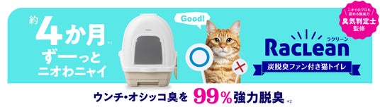 今回発売する「RacLean 炭脱臭ファン付き猫トイレ」は、粒状の活性炭を約200g使用した専用の活性炭フィルター(※5)をセットしたファンにより、ウンチとオシッコいずれのニオイも吸引、吸着することでトイレ内を換気し、脱臭された空気だけをトイレの外へ送出します。臭気判定士が監修した本方式により、室内の気になるウンチ・オシッコ臭を99%脱臭(※2)し、効果は約4か月間(※1)持続します。また、誤作動防止機能の搭載や、猫が本体に登りにくいたまご型の形状、かじりに強い電源コードなど、猫にとっても安心な設計です。消臭サンドと消臭シート(※6)を同梱しているため、購入後からすぐに使用できます。