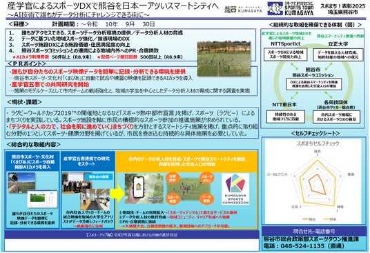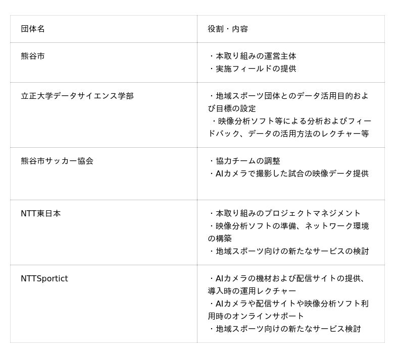 埼玉県熊谷市(市長:小林 哲也、以下「熊谷市」)と立正大学 データサイエンス学部(学部長:家富 洋)、熊谷市サッカー協会(会長:黒澤 三千夫)、NTT東日本株式会社 埼玉支店(支店長:小池 哲哉、以下「NTT 東日本」)、株式会社NTTSportict(代表取締役社長:中村 正敏、以下「NTTSportict」)は、2025年 1月 17日(金)に締結した「産学官連携による映像分析を用いた地域スポーツ活性化に関する共同研究協定書※1」に基づき、地域スポーツの振興とスマートシティの推進を目的に、スポーツDXソリューションを活用した共同研究(以下、「本共同研究」)を実施してまいりました。