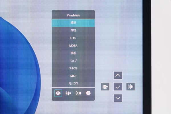 また、ViewSonic独自の画質設定モード、「ViewMode」も便利な機能のひとつだ。「FPS」「RTS」「MOBA」といったゲーム系のほか、「映画」「ウェブ」「テキスト」など、用途に応じて最適な画質設定に切り替えられる。わざわざ細かい設定をいじる必要がなく、ワンタッチで最適な表示モードに変更できるのは、初心者にとってもありがたい。