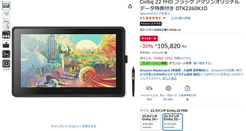 Wacom Pro Pen 2の繊細なタッチと21.5型の大画面を両立したミドルクラスモデル。参考価格162,800円のところ、35%オフの105,820円という大幅割引価格で手に入ります。
