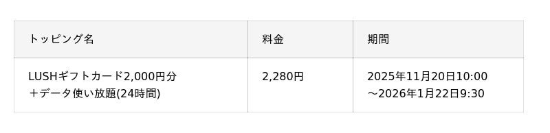 KDDI、沖縄セルラーは2025年11月20日から、povo2.0の「今だけのトッピング」として、初登場となる「LUSHギフトカード2,000円分」と「データ使い放題(24時間)」(注)がセットになったトッピングを2,280円で提供します。