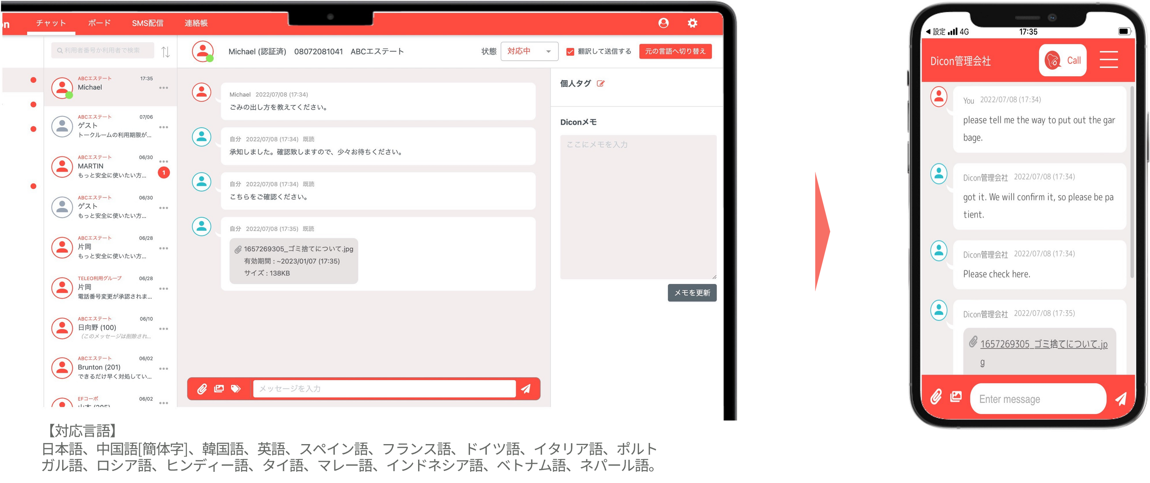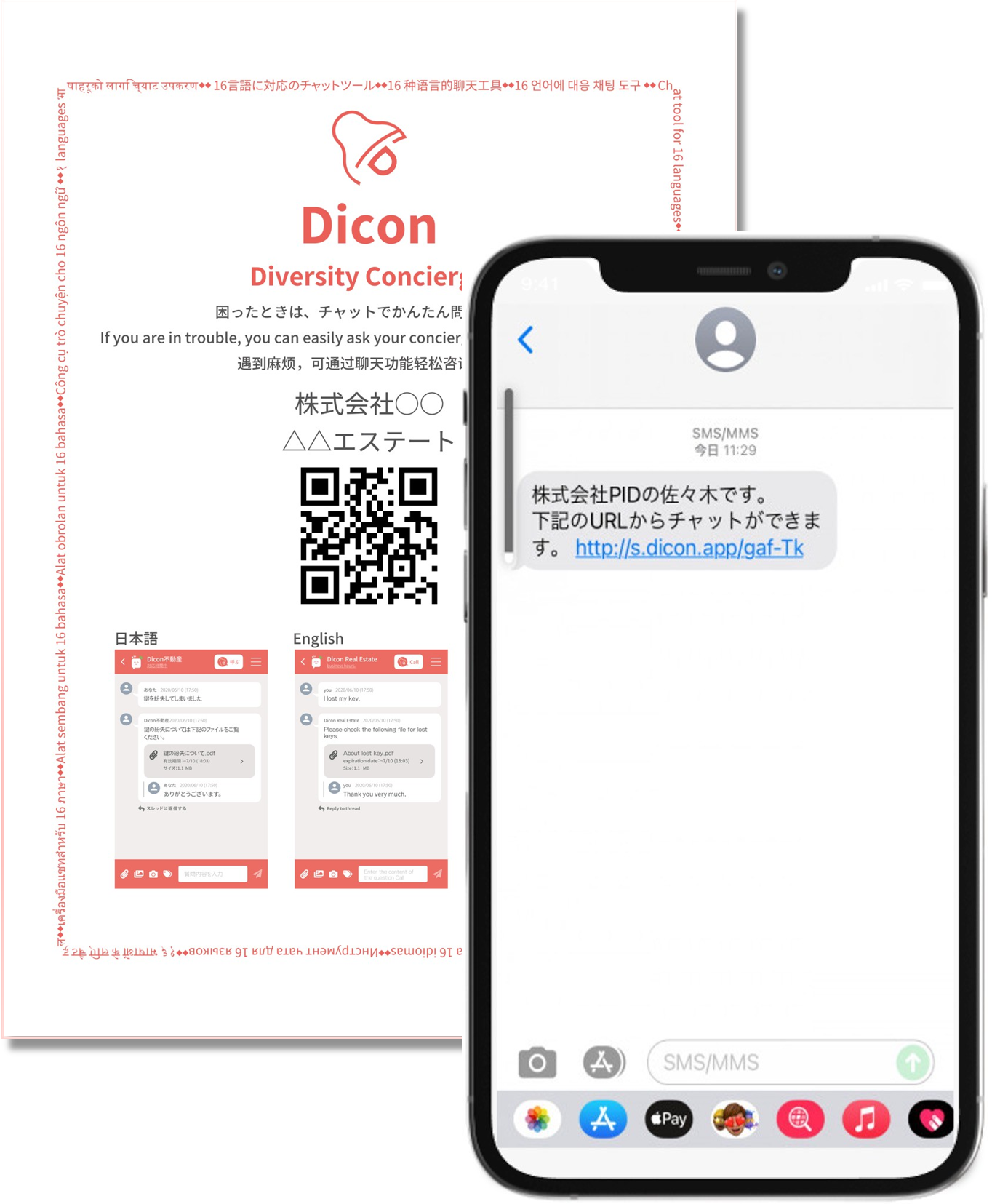 「Dicon」は、不動産賃貸管理業務における多言語対応コミュニケーションを効率化するためのクラウドサービスです。アプリ不要・自動翻訳・履歴管理といった機能により、「言った・言わない」の防止や情報共有のミスを最小限に抑え、不動産管理会社の皆様の働き方改革と生産性向上を支援します。