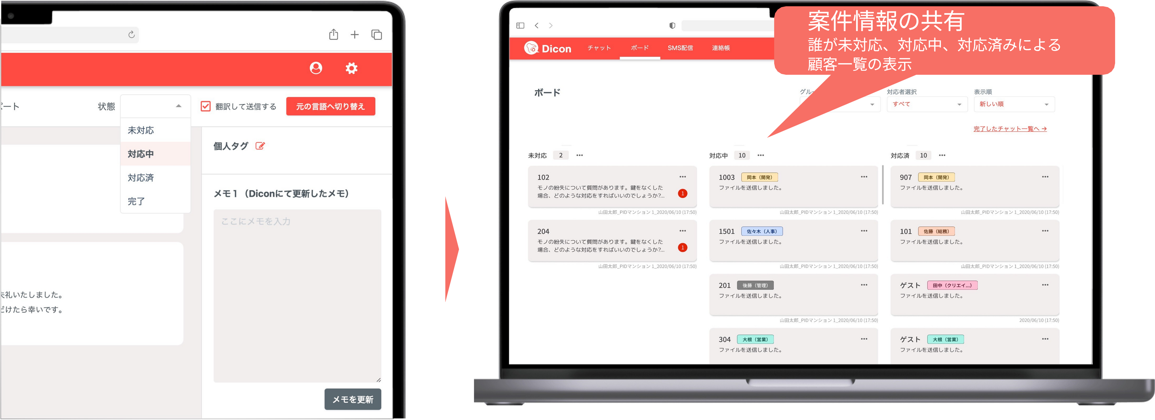 1週間以内であれば編集・削除が可能で、記録は自動保存されるため、柔軟性と証跡性を両立。属人対応から脱却 SMS送信先は「国籍 × 部門」などで分類でき、必要な情報を必要な相手に効率よく届けることが可能 チャットでは既読表示を顧客側に見せず、管理者だけが確認できるため、無用なストレスを与えない配慮設計 チャットごとに「担当者」×「未対応/対応中/済/完了」の進捗が一目でわかる“対応の見える化”を実現