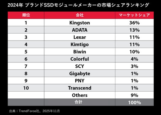 台北- 11月20日、2025 - メモリストレージ製品および技術ソリューションの世界的リーダーであるKingston Technologyは本日、TrendForceが2024年のチャネル市場でのSSDのサードパーティサプライヤーとしてKingstonを第1位に選出したことを発表しました。TrendForceのデータによると、Kingstonは2024年に世界全体のSSD出荷台数のうち36%を占め、過去最高のシェアを記録し、メモリとSSDの世界シェアにおいて首位の座を維持しています。